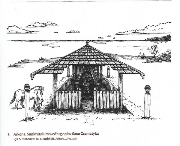 Zgodnie z relacją duńskiego kronikarza Saxo Gramatyka, w środku miasta Arkony znajdował się plac, na którym stała drewniana świątynia o misternej budowie. Świątynia wzbudzała w miejscowych i przyjezdnych cześć zarówno wspaniałością nabożeństw, jak i boskością posągu. Budowla pokryta była czerwonym dachem i zawierała dwa rzędy ogrodzenia, z czego zewnętrzne ozdobione było płaskorzeźbami, zaś wewnętrzne stanowiły czerwone zasłony. W środku znajdował się posąg Świętowita oraz bogaty skarbiec.